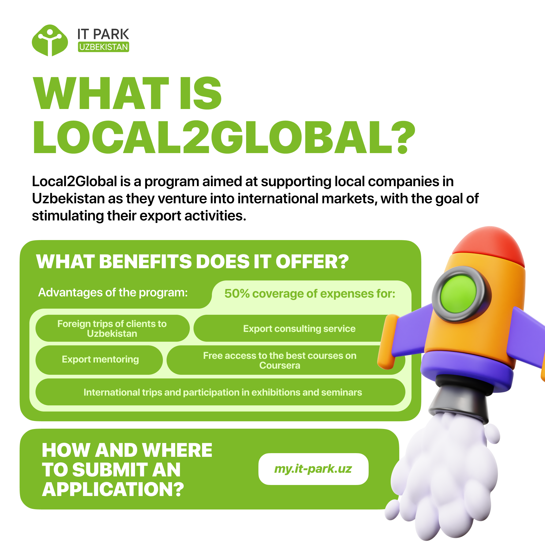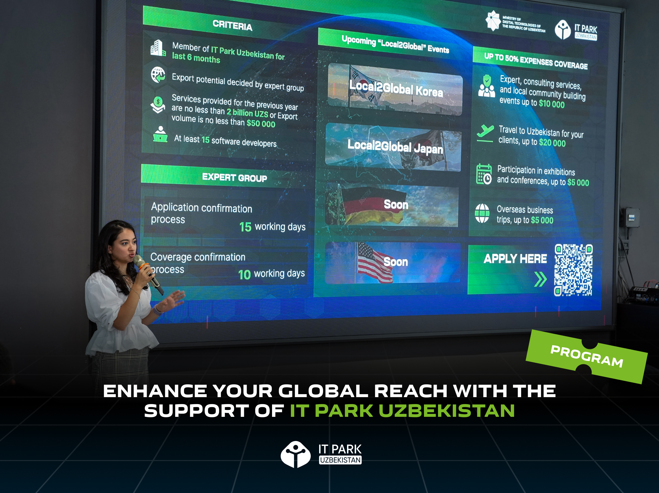 As part of the Local2Global program, participating members are also offered financial support. IT Park Uzbekistan will reimburse up to 50% of the following expenses to encourage company engagement: