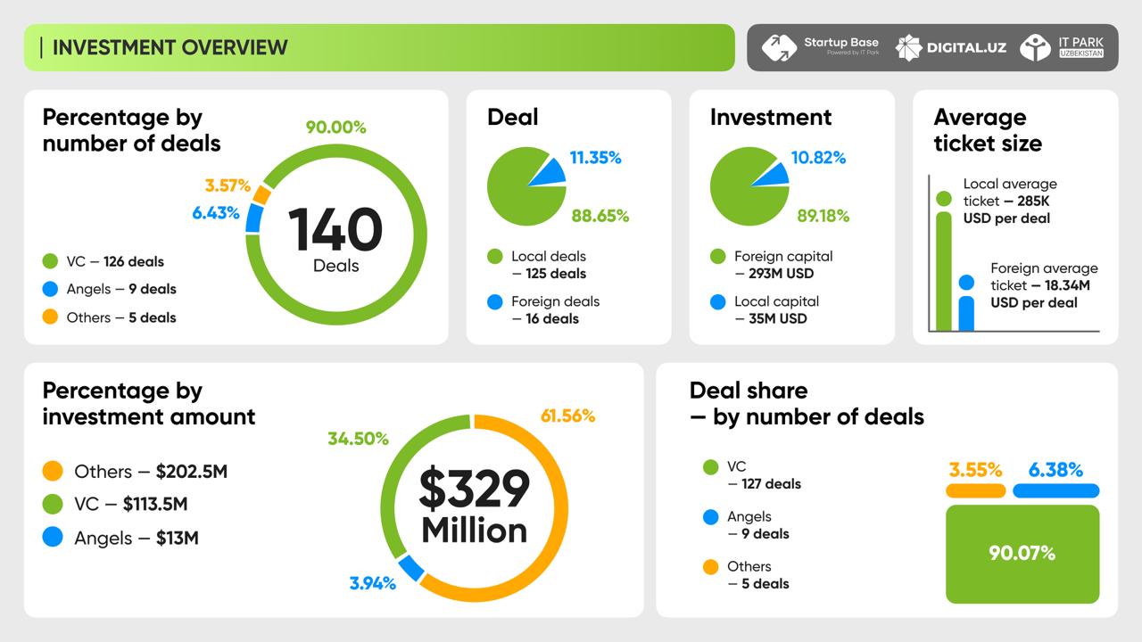 Uzbekistan’s startup ecosystem demonstrated significant growth in 2025. The total volume of investments reached $329 million, which is 522% higher compared to 2024. The number of deals increased more than fourfold — from 38 to 140.