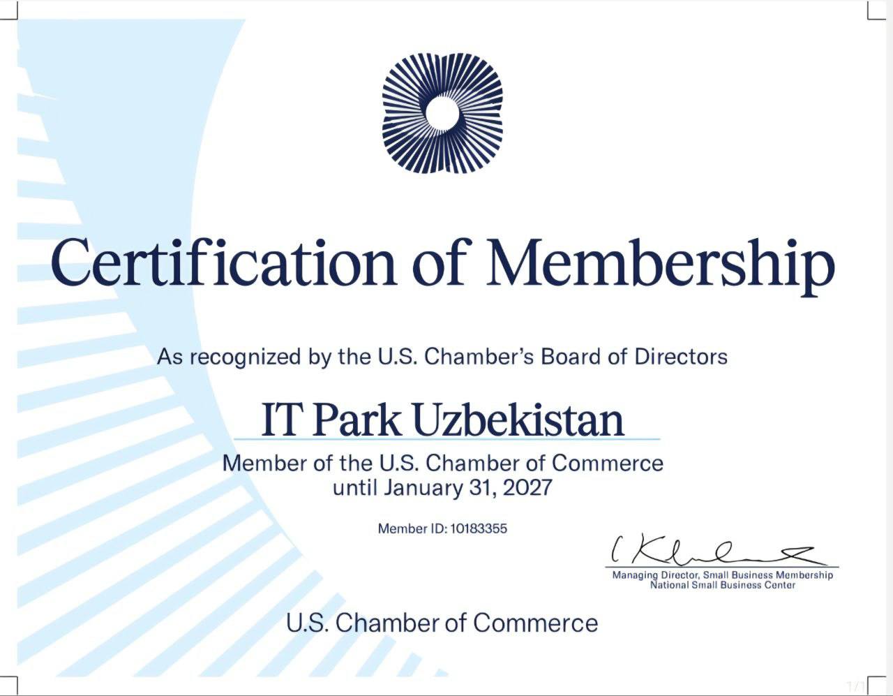 Membership in the U.S. Chamber of Commerce reinforces the institutional standing of IT Park Uzbekistan’s US branch and reflects a systematic, long-term approach to integrating Uzbekistan’s national IT ecosystem into the U.S. business environment. This marks sustained engagement with American business communities rather than a one-time partnership.