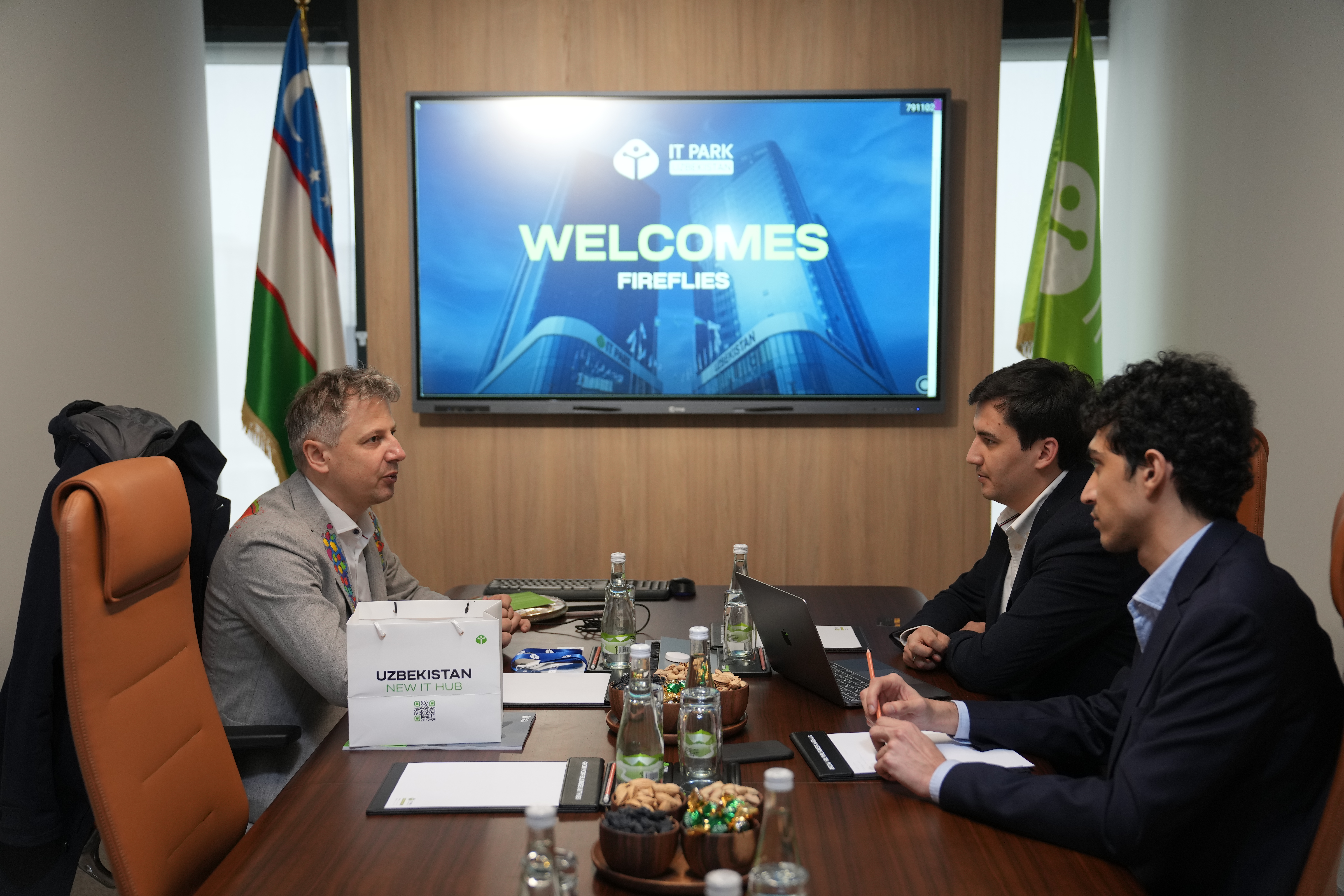 A meeting took place at IT Park Uzbekistan with representatives of Fireflies, a company specializing in the development of educational programs for businesses and universities. The discussion was attended by Michal Nowakowski, Co-Founder of Fireflies, alongside representatives of IT Park Uzbekistan — Jahongir Kagirov, Head of the Service Export Development Department, and Khalid Al Djakhmi, Leading Specialist for EU and UK markets.